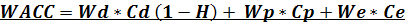 WACC = (0,0136 * 10,17) + (0,028 * 17,75) + (0,8434 * 9,54) + (0,0872 * 9 * (1 – 0,2)) + (0,0055 * 30 * (1 – 0,2)) + (0,0223 * 38 * (1 – 0,2)) = 10%