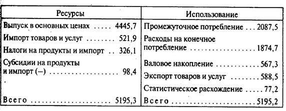 Счет товаров и услуг, как и все другие счета СНС, состоит из двух частей. В части «Ресурсы» показываются выпуск и импорт продуктов, причем в так называемых основных ценах (т.е. без учета косвенных налогов, но с учетом полученных субсидий), а также косвенные налоги (в СНС они называются налогами на продукты и импорт) и субсидии на произведенные продукты и импорт, что необходимо для приведения основных цен к рыночным. В части «Использование» отражаются объемы использования продукции на потребление, накопление и экспорт.