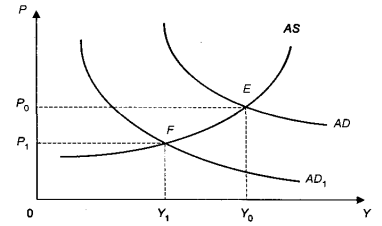 Затем в результате сокращения совокупных расходов кривая ADсдвигается влево, в положение AD]и в экономике устанавливается новое краткосрочное равновесие в точке F.