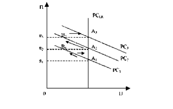 представлена на рис. 5. Фактический темп инфляции в последующем периоде каждый раз превышает ожидаемый уровень инфляции. Пока у экономических агентов сохраняется заниженная оценка инфляции, стимулирующая политика государства дает эффект, приводя в краткосрочном периоде к увеличению реального выпуска продукции и снижению уровня безработицы. Со временем экономические агенты обнаруживают, что рост цен и заработной платы был чисто инфляционным. Они корректируют свою оценку инфляции и начинают адаптироваться к ее новому, более высокому уровню. Снизившаяся на время безработица возвращается к прежней отметке. Если государственная политика продолжается, то весь процесс повторяется, но уже при более высоком уровне инфляции. В долгосрочном периоде экономика будет перемещаться из точки А