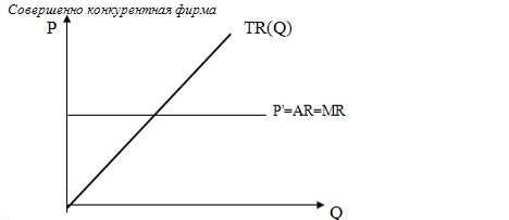 Если фирма действует в условиях совершенной конкуренции, то каждую единицу товара она продает по одинаковой рыночной цене. Это означает, что каждая дополнительно проданная единица товара будет добавлять к совокупному доходу (TR) фирмы одну и ту же величину предельного дохода (MR), равную цене (P) товара. Следовательно, для отдельной фирмы, действующей в совершенно конкурентном рынке, величины средней (AR) и предельной выручки совпадают и представляют собой одну и ту же горизонтальную линию, проведённую на уровне цены товара, то есть, во всех рыночных структурах мах. прибыли происходит на основе равенства предельных издержек (ТС) и предельного дохода (MR), но только в условиях совершенной конкуренции соблюдается равенство предельных издержек, предельного дохода и цены: