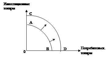 Эта кривая отражает максимальное количество вариантов разнообразной продукции, которая может быть произведена при данном количестве и качестве природных, трудовых ресурсов и основного капитала на основе данного технологического потенциала. Усиление позитивного воздействия со стороны любого из факторов предложения (увеличение количества и улучшение количества ресурсов, и технический прогресс) смещает кривую производственных возможностей вправо, что показано как сдвиг от АB к CD. Но возможность экономики полностью реализовать свой производственный потенциал ограничивается факторами спроса и распределения. Кривая производственных возможностей может сместиться вправо, но действительный уровень производства не достигает возможного. Иначе говоря, кривая реальной экономической деятельности будет находиться внутри площади, ограниченной кривой производственных возможностей