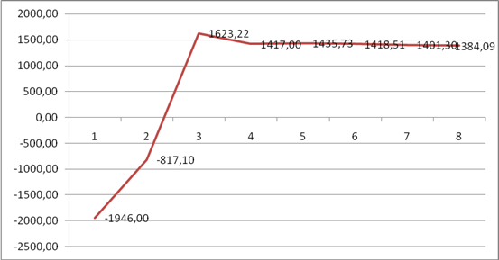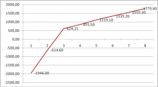 Как видно из таблицы 5, на втором интервале планирования денежный поток = +524,06, следовательно, срок окупаемости составляет 2 года.
