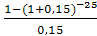 Участок земли сдается в аренду на 25 лет с ежегодной арендной платой 30000 руб. Ожидается что стоимость земли составит 500000 руб. в конце периода аренды. Определить текущую стоимость имущественных прав на землю при ставке дисконтирования 15%.