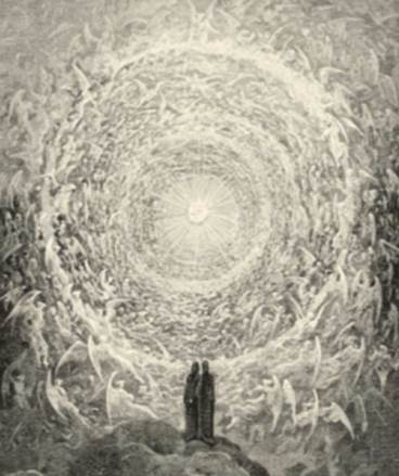 Беатриче возносит Данте на девятое небо, к Перводвигателю и разъясняет своему спутнику устройство высших райских сфер. Перводвигатель – это кристальное последнее небо, которое движется с максимальной скоростью, т.к. стремится каждую свою точку соединить с каждой точкой Эмпирея. Эмпирей – невещественная и непространственная световая сфера, Рай в собственном смысле слова. Данте видит отраженное в глазах Беатриче божество и, обернувшись, усматривает ослепительную точку, окруженную вращающимися кругами. Эти девять окружностей эмпирея суть девять ангельских чинов, описанных некогда в сочинении «Об небесной иерархии» Дионисия Ареопагита. Сила любви и света все больше у серафимов – высшего ангельского чина, который правит наибольшей телесной сферой космоса – Перводвигателем. Беатриче предостерегает путника от попыток представить ангельскую духовность по аналогии с человеческой.