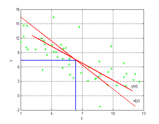 t = 10.86 - 0.6*y; %построение регрессии X на y