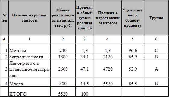 Для всего объема потребностей предприятия в материалах был проведен АВС-анализ. Для анализа была выбрана только та номенклатура МПЗ, которая непосредственно используется в производственном процессе предприятия.
