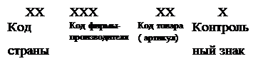 обозначают страну происхождения товара (табл. 3.1.). Присвоение кода внутри любой страны производится торгово-промышленной палатой, где регистрируется каждый производитель товаров. Следующие четыре-пять цифр указывают на фирму-производителя товара. Затем наносятся еще пять цифр, обозначающих код товара (рис.2.2.).