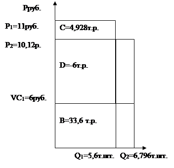 На графике это соответствует сумме площадей А+В. Из этой выручки фирма покрывала переменные затраты VC=6 руб./шт., - на единицу продукции, а общий объем затрат составит V=6*5,6=33,6 тыс. руб., или площадь прямоугольника В.