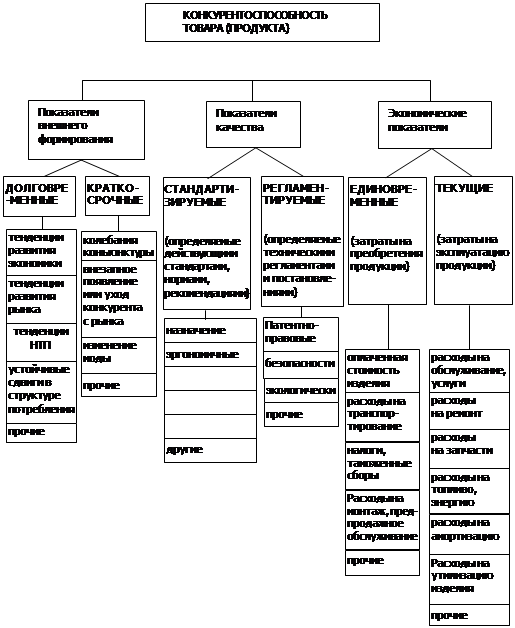 главный объект на рынке. Он имеет стоимость и потребительную стоимость (или ценность), обладает определенным качеством, техническим уровнем и надежностью, задаваемой потребителями полезностью, показателями эффективности в производстве и потреблении, другими весьма важными характеристиками. Именно в товаре находят отражение все особенности и противоречия развития рыночных отношений в экономике. Товар - точный индикатор экономической силы и активности производителя. Действенность факторов, определяющих позиции производителя, проверяются в процессе конкурентного соперничества товаров в условиях развитого рыночного механизма, позволяющего выявить отличия данного товара от товара-конкурента как по степени соответствия конкретной общественной потребности, так и по затратам на ее удовлетворение. Для этого товар должен обладать определенной конкурентоспособностью.