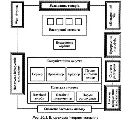 Ці інструменти повинні забезпечити розрахунки, конфіденційність, цілісність інформації, аутентифікацію, авторизацію, безпеку, мінімізацію витрат. Блок-схема Інтернет-магазину може бути подана таким чином (рис 20.3).