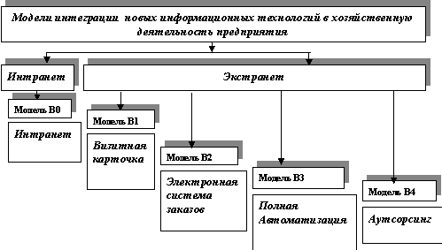 Начальным этапом интеграции предприятия можно назвать создание внутренней информационной системы – системы типа интранет (модель B0). На этом этапе Интернет используется как инструмент для реализации эффективной системы внутренних коммуникаций на предприятии. Доступ к информационным ресурсам такой системы предоставлен только сотрудникам данного предприятия и защищен от внешнего мира специальными средствами. Интранет-системы повышают оперативность обмена информацией между всеми сотрудниками, облегчают установление обратных связей, позволяют персоналу вести совместную работу независимо от местонахождения. Подобные системы снижают некоторые трансакционные издержки предприятия, связанные с формированием и поддержанием внутренней информационной среды организации, оптимизируют процессы планирования и управления. Таким образом, применение сети «интранет» позволяет повысить эффективность функционирования внутренних процессов предприятия.