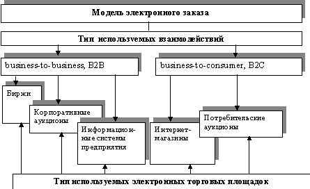 Первая категория торговых площадок представляет собой информационные торговые системы электронного обслуживания клиентов на уровне отдельного предприятия. Потребитель через торговую информационную систему более высокого порядка сложности, чем та, которая описывалась в предыдущей модели интеграции, формирует заказ на производство, фактически управляя складом поставщика. Информационная торговая система позволяет автоматизировать работу всей торговой площадки, выполняя следующие функции: поиск в прайс-листе необходимой позиции, введение архива, составление бухгалтерской отчетности, анализ спроса и предложения, выбор и оптимизация путей доставки, выбор наилучшего варианта и реализация оплаты и страховки и т.д. Размещение заказа потребителя будет автоматически запускать производство товара в нужной конфигурации.