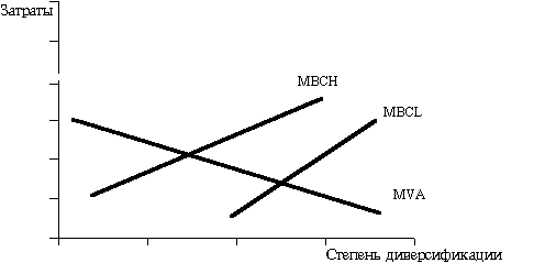 При решении о диверсификации деятельности компании следует учитывать стоимость управления такой компанией. Эти затраты определяются числом СЗХ и необходимостью координации между ними. Так, затраты на управление больше в компании из 12 СЗХ, которые обладают определенным синергизмом, чем в компании из 10 СЗХ, которые не обладают этим качеством. Это иллюстрировано рис.1. Удельные затраты на управление диверсифицированной компании при высокой потребности в координации (МВСН) сравниваются с таковыми для компании с низкой потребностью в координации (МВСL). Предположим, что компания с высокой потребностью в координации стремится усилить свое положение путем синергизма СЗХ. А компания с малыми потребностями в координации следует стратегии внутреннего рынка капитала или реструктурирования. Как видно, на каждом уровне диверсификации соответствующие значения прямых МВСH больше значений МВСL. Если мы примем, что обе компании имеют одинаковые кривые удельных затрат на управление МVA, компания с низкой нуждой в координации имеет рентабельность управления больше, чем компания с высокой нуждой в координации.
