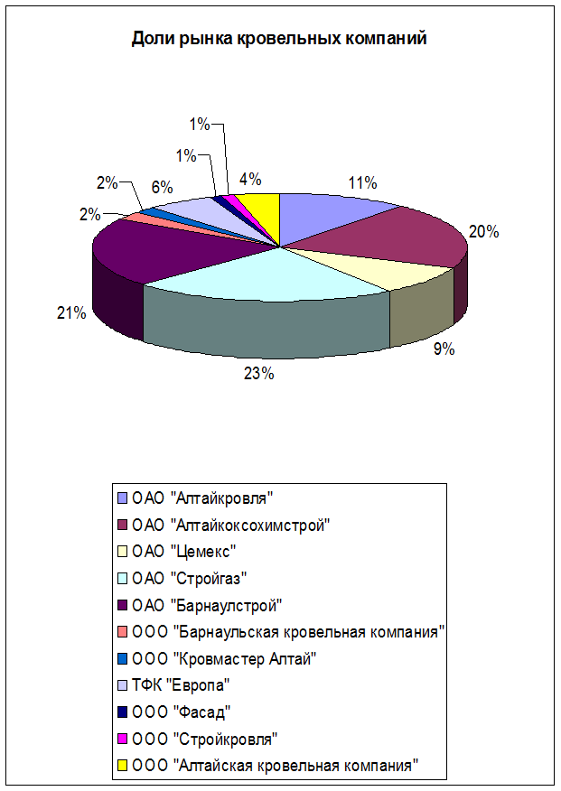 Исследования рынка кровельных работ показали, что ООО «Алтайская кровельная компания» занимает седьмое место среди других строительных и кровельных компаний Алтайского края (см. ПРИЛОЖЕНИЕ 1).
