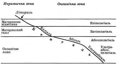 3. Світовий океан є складною структурно-функціональною системою із специфічною геологічною і геоморфологічною будовою, геохімічними, фізико-хімічними і біологічними процесами, які протікають у товщі води і донних відкладеннях. Океани і моря по вертикалі і горизонталі розділяються на окремі зони. Прилегла до морського дна зона називається бенталь,