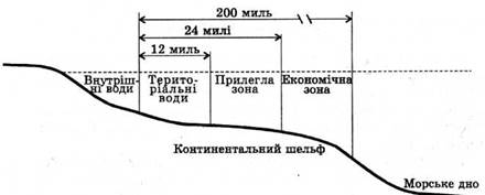 На шельфі океанів і морів добувають мільйони тон нафти, мільярди кубометрів природного газу та інших корисних копалин. Правовий статус морських прибережних територій регулюється Конвенцією Організації Об'єднаних націй з морського права (1982 p.). Виділяють такі зони континентального шельфу: внутрішні води (морські лимани, заливи, лагуни), територіальні води країни, що охоплюють прибережну смугу шириною 12 морських миль, прилеглу зону, яка відміряється від прибережної лінії територіальних вод у глиб океану (моря) на 24 морські милі, та економічну зону шириною до 200 морських миль в сторону відкритого моря (одна морська миля відповідає 1,85 км) (рис. 2) [5]. У межах цих зон закріплюється правовий статус прибережних держав.