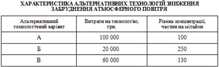 На практиці аналіз ефективності витрат вимагає ретельної аналітичної розробки альтернатив. Розглянемо проект, де за мету береться зниження забруднення атмосферного повітря коксохімічним комбінатом. Під час розгляду численних альтернатив технологій зниження забруднення атмосферного повітря при нормі гранично допустимої концентрації 120 частин на мільйон аналітики відібрали три, характеристики яких викладені у табл.1.