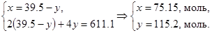 В реактор попадает готовый раствор серной кислоты, в котором вода находится в связанном состоянии. Энергия, высвободившаяся при получении раствора, не должна учитываться при разбавлении в ходе процесса нитрования. Предполагается, что разбавление исходного раствора серной кислоты протекало по первому уравнению (путь 1), т. е. разбавление шло при одинаковом мольном соотношении исходных веществ. Учитывая это, количество серной кислоты связанной с водой равно количеству воды связанной с серной кислотой, отсюда: