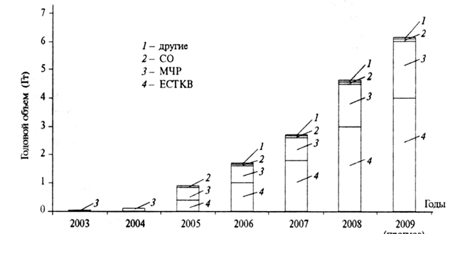 Стоимость прав на вредные выбросы парниковых газов на международном рынке в 2006 г. составляла 30 млрд. евро, в 2007 г. - 40 млрд., в 2008 г. - уже 92,4 млрд. евро. В дальнейшем ее повышение прогнозировалось на уровне 62,6 млрд. евро. При этом основная часть сокращений приходится на ЕСТКВ. На рисунке 1 приведены данные роста мирового рынка прав на вредные выбросы парниковых газов в количественном измерении.