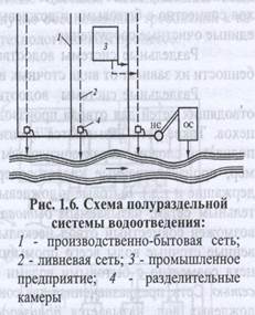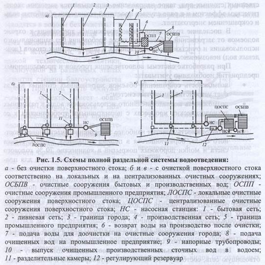Полная раздельная система водоотведения имеет несколько водоотводящих сетей, каждая из которых предназначена для отведения сточных определенного вида (рис. 1.5, а).