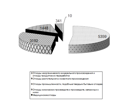 Всего в стране образуется свыше 1,5 тыс. видов отходов с широким спектром морфологических и химических свойств. Если рассматривать структуру образования отходов производства без учета отходов переработки калийных руд, то в общей массе (10349 тыс. т) велика доля отходов растительного и животного происхождения (30,8%), отходов неорганического минерального происхождения (51,8), а также отходов промышленности, подобных твердым бытовым отходам (14%). Оставшиеся 3,4% приходятся на отходы химических производств и медицинские отходы (рис. 1).