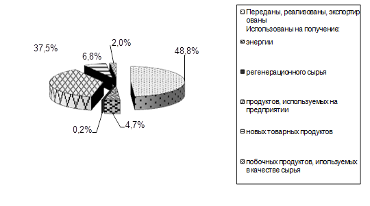Уровень использования отходов производства в 2007 г. составил 22,3%, увеличившись за год на 1,3%. На рисунке 2 показаны направления использования отходов, большая часть которых (51,2%) использована на нужды самих предприятий, свыше 48,2% переданы другим предприятиям, реализованы физическим лицам или экспортированы для дальнейшего использования.