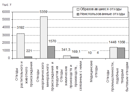 Рис. 3. Соотношение объемов образовавшихся и неиспользованных производственных отходов различных видов в 2007 г. (без учета галитовых отходов и глинисто-солевых шламов), тыс. т