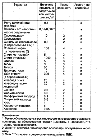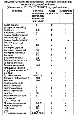ПДК некоторых загрязняющих веществ в воздухе рабочей зоны