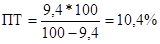 Расчет трудоемкости 1 млн.руб. товарной продукции показал, что в отчетном периоде показатель снизился на 9,4%. Исходя из того, что изменение интенсивности труда прямо пропорционально снижению трудоемкости выпущенной продукции, рост производительности труда определяется по формуле: