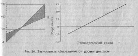 Но на уровне в 350 млрд. руб. потребление уравнивается с доходом, а на уровне в 375 млрд. руб. появляются и сбережения. График сбережений рис.26 показывает кривую сбережений (С), имеющую также наклон вверх и находящуюся сначала ниже, а затем выше оси абсцисс.