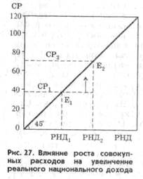 В поисках ответа на этот вопросы Кейнс исследовал влияние автономного роста совокупных расходов и автономного роста элементов, составляющих совокупные расходы, на равновесный уровень национального дохода. Посмотрев на рисунок 27, мы можем убедиться в том, что автономный рост совокупных расходов (СРг