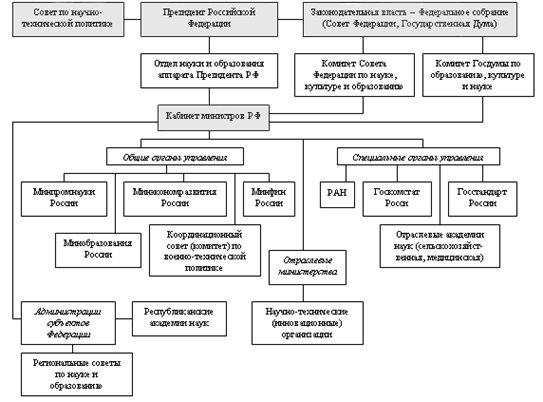 В формировании государственной научно-технической, инновационной политики и ее реализации участвуют все межотраслевые органы, среди них следует выделить Министерство науки и технологий РФ, Министерство экономики, Государственный комитет по промышленной политике, Министерство финансов РФ.