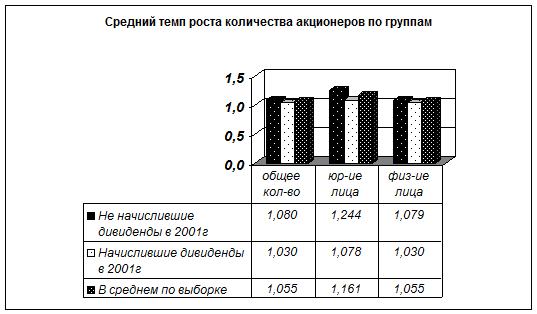 В качестве показателя, косвенным образом характеризующего указанное соотношение, нами был взят средний темп роста количества акционеров в целом и по группам. При этом акционеры – юридические лица – рассматривались как мажоритарные собственники, а физические – как миноритарные. ОАО выборки были разделены на две группы: начислившие и не начислившие дивиденды в 2001 году. Таким образом, было изучено влияние выплаты дивидендов в 2001 году на изменения количественного состава акционеров в 2002 году.