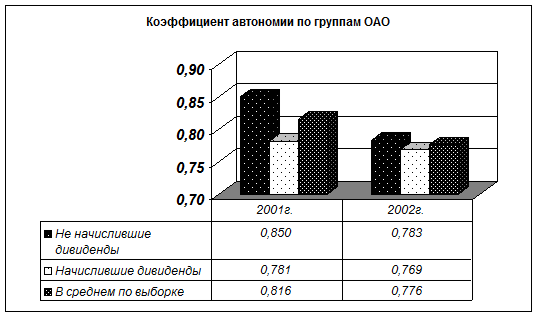 Влияние уровня дивидендных выплат на средневзвешенную цену капитала обусловливает зависимость структуры источников финансирования деятельности от дивидендной политики. Для выявления этой зависимости в качестве индикатора был использован коэффициент автономии, рассчитываемый как отношение собственного капитала к суммарному активу. Он характеризует зависимость фирмы от внешних займов. Чем выше его значение, тем меньше займов и ниже риск неплатежеспособности.