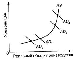 Таким образом, можно заметить, что, если экономика находится в состоянии спада и характеризуется почти горизонтальным кейнсианским отрезком кривой совокупного спроса, политик "дешевых денег" сместит кривую совокупного спроса из положения ADl в положение AD2 и сильно повлияет на реальный объем производства и занятость. Однако оно вызовет существенное повышение уровня цен. На рис.3 это показано смещением совокупного спроса из положения AD3 в положение AD1 на классическом, или вертикальном, отрезке кривой совокупного предложения. Само собой разумеется, что политика "дешевых денег" явно неуместна, когда экономика достигла или близка к состоянию полной занятости. Рисунок 3 указывает причину: она привела бы к высокой инфляции.