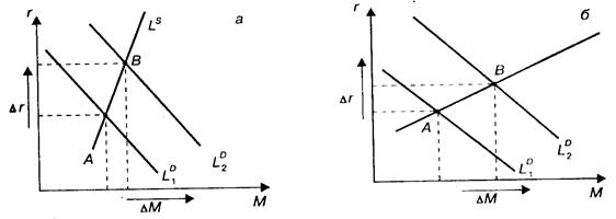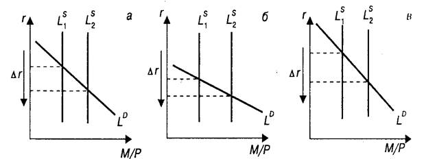 Однако реакция денежного рынка зависит от характера спроса на деньги, т.е. от крутизны кривой LD. Если спрос на деньги достаточно чувствителен к изменению процентной ставки, то результатом увеличения денежной массы станет незначительное изменение ставки. И наоборот, если спрос на деньги слабо реагирует на процентную ставку (крутая кривая LD), то увеличение предложения денег приведет к существенному падению ставки (рис.2, в).