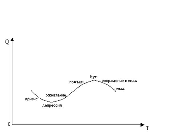 Цикл представляет собой интервал времени в развитие экономики, в течении которого происходит увеличение объемов производства товаров и услуг, а затем сокращение, спад, депрессия, оживление и, наконец, снова рост.