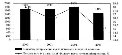 Рис.2. Кількість підприємств, що здійснювали інновації у промислові підприємства у 2000-2003 роках [1]