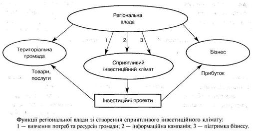 З метою стимулювання економічного розвитку територій і пришвидшення у них інвестиційних процесів на регіональному та місцевому владних рівнях має здійснюватись цілеспрямована стратегія формування іміджу регіону як привабливого об'єкта вкладання інвестицій, зокрема: формування бази даних для потреб широкого кола інвесторів щодо економічного і правового середовища, інвестиційного потенціалу та конкурентних переваг території; запровадження і постійна підтримка дії ефективних каналів поширення інформації щодо потреб та можливостей території, в тому числі рекламного характеру; активна участь і посередництво в налагодженні ділових контактів між представниками місцевих бізнесових кіл та потенційними інвесторами; адміністративний і консультативний супровід інвестиційних проектів. Мета та завдання регіональної влади в інвестиційному процесі можуть бути представлені у вигляді функціональної моделі (див. рисунок 4).