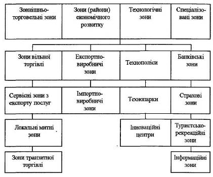 Україна дотримується класифікаційної схеми, яка враховує: місце розташування зони у відповідності з географією розміщення щодо державного кордону: внутрішні (у внутрішніх районах країни) і зовнішні (безпосередньо біля державного кордону); характер об'єкта зонування: локальні (точкові), створені на основі невеликих територій окремих підприємств, транспортних вузлів і комплексні - значні за розміром територіальні утворення, адміністративно-територіальні одиниці, які виконують численні функції; взаємовідносини з національною економікою приймаючої країни: інвестиції, у механізмі яких закладено принцип тісної взаємодії з суб'єктами господарської діяльності поза зоною, розвиток горизонтальних зв'язків, і анклавні, що створюються переважно з метою збільшення впливу вільно концентрованої валюти і локалізуються на невеликій території при незначному спілкуванні з рештою економіки; функціональну орієнтацію, коли розрізняють на основі критерію виконання певних функцій зовнішньоторговельні, торговельно-виробничі, науково-технічні, туристичні, банківсько-страхові, інформаційні зони.