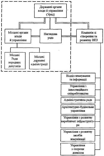Схеми управління ВЕЗ повинні бути досить гнучкими, враховувати систему адміністративного управління, специфіку соціально-економічного розвитку регіону тощо. Під час заснування комплексної багатофункціональної зони, розташованої на території, кордони якої збігаються з кордонами адміністративно-територіальних одиниць, найефективнішою вважають схему управління, яка складається з місцевих органів влади, спеціально створеної державою спостережної ради та компанії зі створення і розвитку ВЕЗ (рис. 2).