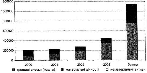 Постійне зростання абсолютних сум інвестованих коштів у формі грошових внесків (включаючи кредити) та матеріальних цінностей відбувалося з різною інтенсивністю, внаслідок чого змістились акценти: матеріальні внески, які у 2000 році формували базу інвестиційних ресурсів ($107,5 млн., або 47,2%), перестали відігравати провідну роль, перемістившись на другу позицію ($94,9 млн., або 19%), натомість посилилася частка грошових внесків (2000 р. - $93,3 млн., або 41 %; 2003 р. - $344 млн., або 69,3%).