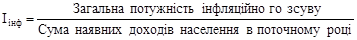 Під потужністю інфляційного зсуву у витратах населення на товари та послуги розуміють абсолютну вартісну оцінку зниження купівельної сили грошей за рахунок інфляційного зростання середніх цін та тарифів, яка може бути обчислена як різниця чисельника та знаменника індексу цін , в якому в практиці міжнародних зіставлень динаміки цін за базовий узято рівень 1967 р. Він ураховує формування надлишкових заощаджень та приховане зростання цін (зниження якості товарів за незмінних цін).
