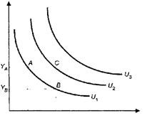 Если с точки зрения данного потребителя наборы А и В равноценны, то точки А и В лежат на одной кривой безразличия. Кривая безразличия С, лежащая выше и правее другой кривой, показывает более предпочтительные для данного потребителя наборы товаров.