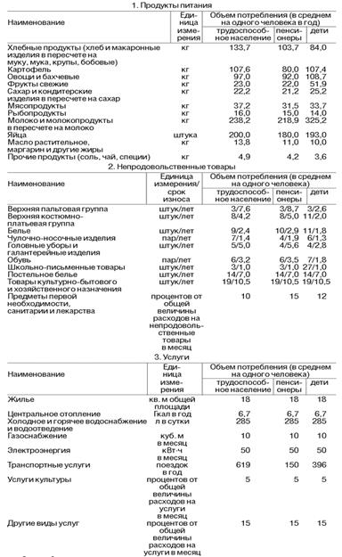 Состав перечисленных выше видов потребительских корзин рассчитывается в натуральных показателях в среднем на душу населения, семью, или в целом на домашнее хозяйство. Состав потребительской корзины[1]