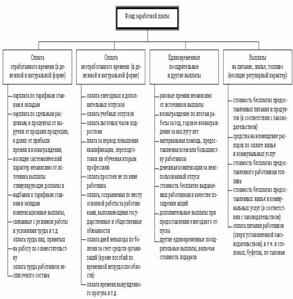 Состав фонда заработной платы - начисленные предприятием, учреждением, организацией суммы оплаты труда в денежной и натуральной формах за отработанное и неотработанное время, стимулирующие доплаты и надбавки, компенсационные выплаты, связанные с режимом работы и условиями труда, премии и единовременные поощрительные выплаты, а также выплаты на питание, жилье, топливо, носящие регулярный характер.