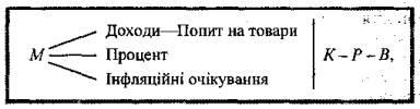 де М- кількість грошей, К – кон'юнктура ринку, Р –ціни, В – виробництво.