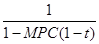 Тут вже G не стала, а змінна величина. Вираз зветься мультиплікатором державних витрат і відображає, наскільки зміна державних витрат G може змінити сукупні доходи (випуск). Нехай гранична схильність до споживання MPC = 0,5, частка податків у доходах t = 0,4, а державні видатки зросли на 21 млн. гр. од. Тоді сукупні доходи (випуск) зростуть на 30 млн. гр. од., тому що мультиплікатор державних витрат складає 10/7.