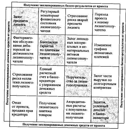 Шесть мероприятий, нацеленных на своевременность и полноту денежных расчетов с лизингополучателем, расположены ниже главной диагонали матрицы. Чем ближе конкретный инструмент к диагонали и к левому углу матрицы, тем он более желателен для инвестора-кредитора и более вероятен практически.